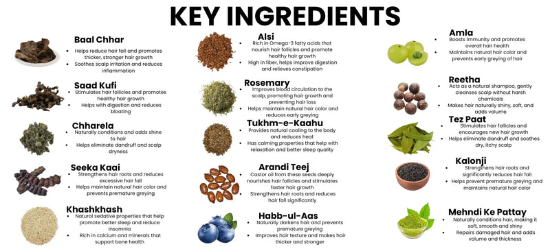 Revada Hair Oil is formulated with Baal Char, Chil Chilkar, Akar Kara, and other time-tested botanicals, this unique blend is inspired by traditional Ayurvedic remedies known to support hair health and vitality. Its natural ingredients are carefully chosen to help nourish the scalp, strengthen hair follicles, and assist in preventing excessive hair fall from the roots. Sika Kai provides gentle cleansing properties, while Khar Khsad and Ratan Jod work to restore hair strength and promote overall scalp health. The formula combines heritage wisdom with modern beneficial oils like Almond, Avocado, Castor, and Rosemary Oil, working gently from within to support relief from hair thinning and helping in the natural recovery process from hair damage and breakage. With consistent use, Revada Hair Oil nourishes, repairs, and revitalizes, leaving you with improved hair texture, enhanced growth, and silky, lustrous locks that radiate natural beauty.
